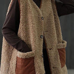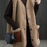 Diese ärmelose Teddyweste bietet kuscheligen Komfort mit auffälligen Kontrasttaschen. Der lockere Schnitt und die Knopfleiste machen sie ideal zum Überziehen in der Übergangszeit.